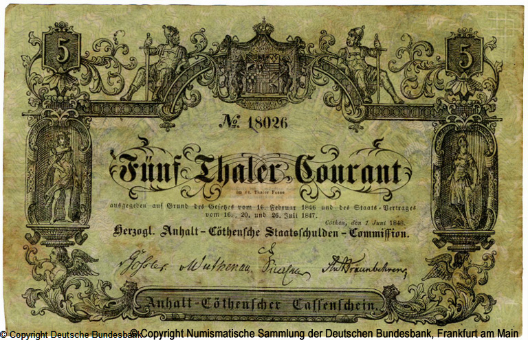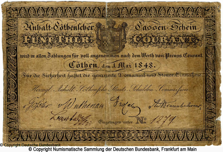 - Katalog der Banknoten des Fürstentums Anhalt-Köthen (Catalogue of banknotes of the Principality of Anhalt-Köthen)