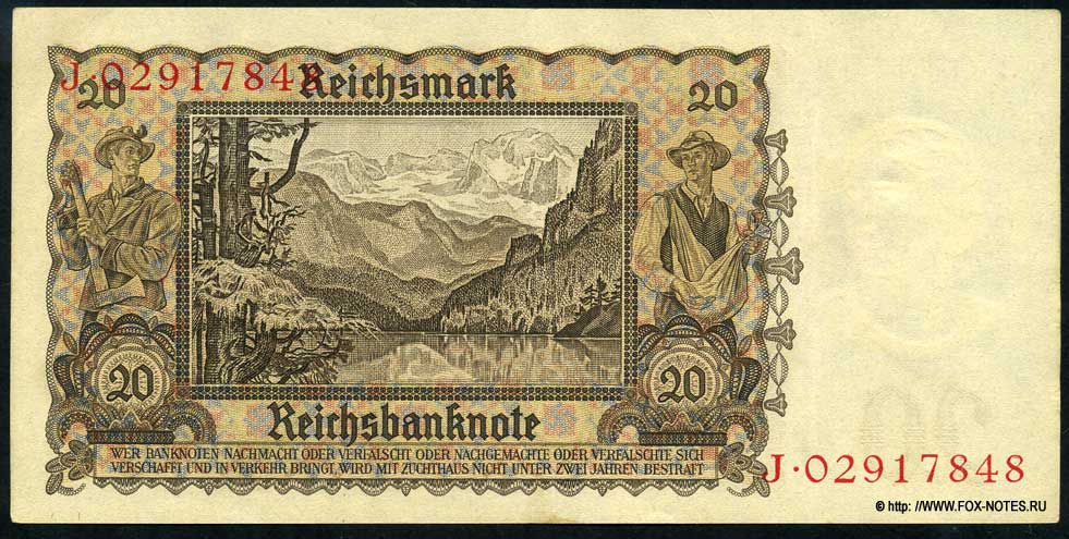 REFERENCE: Issues of the Reichsbanknote 1939 and 1942. Banknotes were in circulation until 1948. The basis of the design of 20 stamps of 1939 was the Austrian banknote of 100 shillings 1936. 5 1942 stamps are found with an inverted watermark.