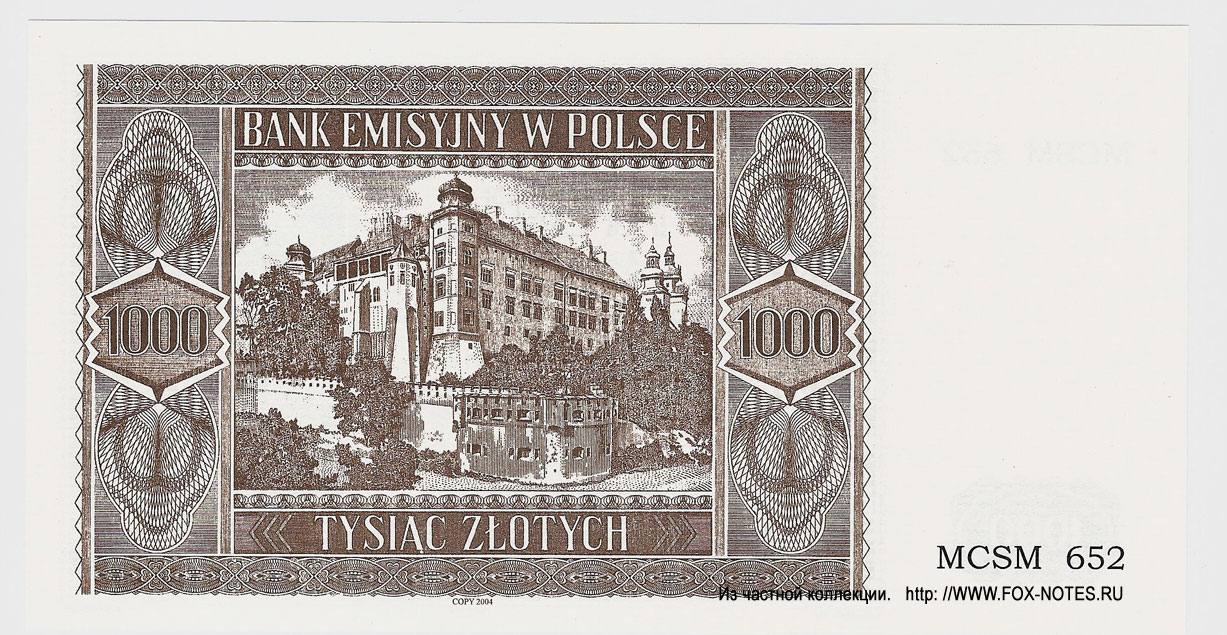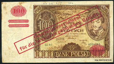 Printing: 1, 2, 5, 100 z . -   Zakłady Graficzne Banku Emisyjnego, Kraków; 1, 5, 50, 100 cl. Wytwórnia Papierów Wartościowych, Warszawa *3. Notes:   * 1 - sample for sample archive - Abteilung Mustersammlung.  * 2 - high-quality fakes of English origin. * 3 - there is no exact data on the series of which banknotes were printed in a specific printing house. * 4 - banknote of 1000 zl. existed only in the form of projects, in 2004 copies of banknotes were printed with reconstructed clichés. MCSM series. It should be noted that the reverses of the copies do not correspond to the well-known photograph of the project, namely, the reverse texts in the photograph are made in Ukrainian, on the copies these texts are in Polish. IMPORTANT! In accordance with the federal law banning Nazi symbols, banknotes, emblems and coats of arms with symbols of the Third Reich posted on the site are not intended to promote the ideas of Nazism. These items are intended to familiarize themselves with the history of money circulation and are not propaganda of Nazi paraphernalia in the understanding of Article 20.3 of the Code of Administrative Offenses and the law "On perpetuating the victory of the Soviet people in the Great Patriotic War of 1941-1945." Also, the materials published on the site are in no way aimed at inciting hatred or enmity, as well as humiliating the dignity of a person or group of persons on the grounds of gender, race, nationality, language, origin, attitude to religion, as well as belonging to any social group.