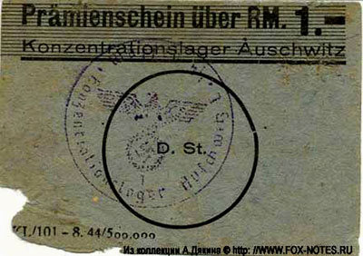 333333-Konzentrationslager Auschwitz Prämienschein RM. 1-444444