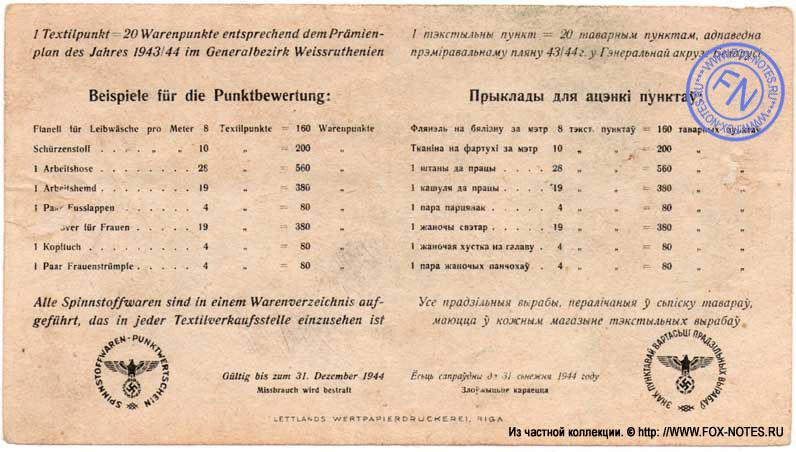 REFERENCE: Textile coupons. Reichskommissariat OSTLAND. Issues for Belarus.