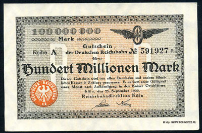 333333-Reichsbahndirektion Köln 100 millionen 1923-444444
