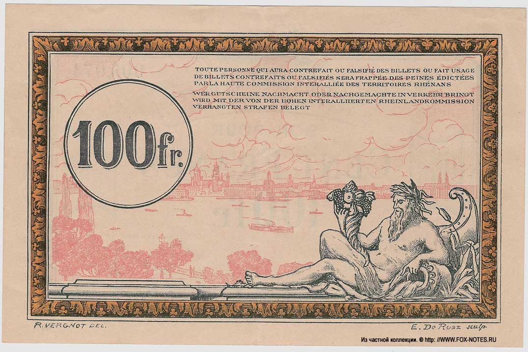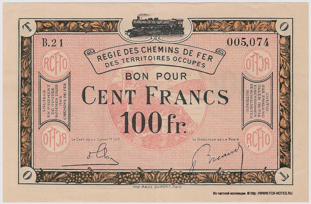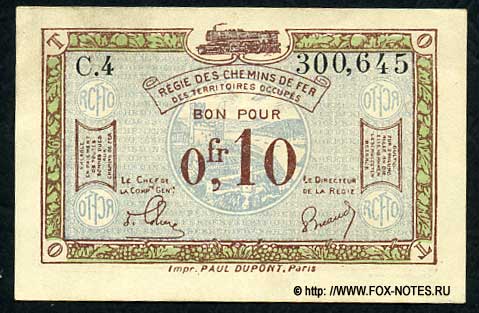 {SH2.0: §II. F-A/a}  {§III}  1.1. Emission: Rhineland 1923 French release for occupied Rhineland territories.  1.2. Reference: The Ruhr conflict is the culmination of the military-political conflict between the Weimar Republic and the Franco-Belgian occupation forces in the Ruhr basin in 1923. In the period from January 11 to 16, 1923, French and Belgian troops, initially numbering 60 thousand people (later up to 100 thousand), occupied the entire territory of the Ruhr region, taking the coal and coke production facilities located there as a "production collateral" to ensure the fulfillment by Germany of its reparation obligations.   Regie des Chemins de fer des Territories Occupes - Railway Administration of the Occupied Territories. 3.1. Rosenberg H. Grabowski H.  Die deutschen Banknoten ab 1871. H.Gietl Verlag &  Publikationsservice GmbH, Regenstauf.Auflage: 19., Auflage 2013/2014  (REV). (31. Oktober 2013) ISBN 978-3866465534 3.2. Grabowski H. Die  deutschen Banknoten ab 1871. Battenberg Gietl Verlag GmbH. Auflage:  21., Auflage 2018 (7. Dezember 2017) {Catalog code - "Ro"} 3.3. Albert Pick  Jens-Uwe Rixen (Bearb. Hans L. Grabowski) Papiergeld-Spezialkatalog  Deutschland. Auflage 3. Gietel Verlag, 1998. 3.4. Standard Catalog of World Paper Money, General  Issues, 1368-1960. Krause Publications; Sixteenth Edition (16) (29. Dezember 2016 3.5. Fayette Claude. Les billets de la Banque de  France et du Trésor 1800-2002. Edition Numismatique & Change; Édition : édition 2007 (5 mars 2007). ISBN 978-2350580654 /  2350580652 {Directory cipher - "F"}