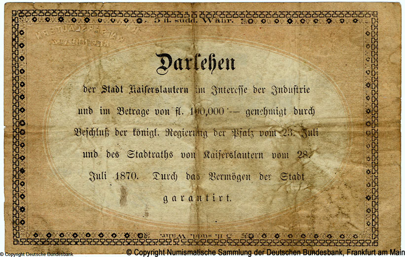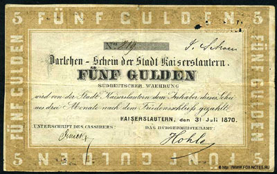 333333-Darlehen-Schein der Stadt Kaiserslautern. 1870. 5 guilders-444444