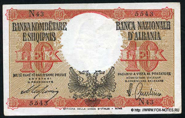 Albanian kingdom. Banka kombёtare e Shqipnis - Banca Nazionale d’Albania. Issue of banknotes of 1940