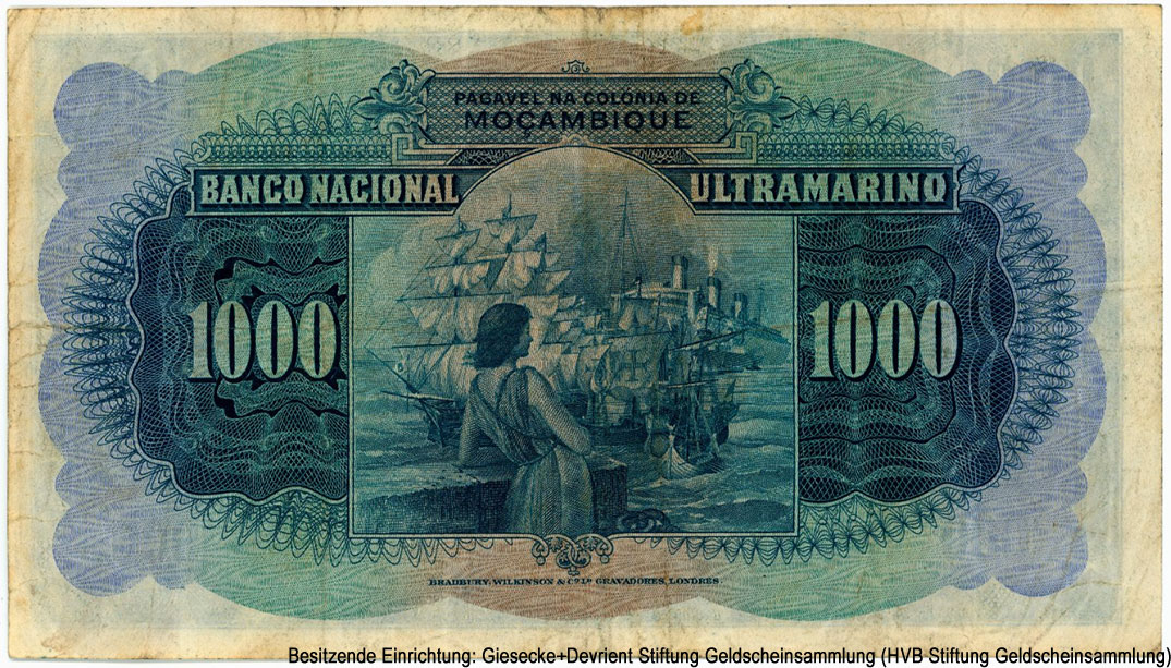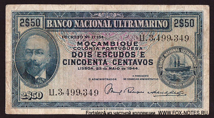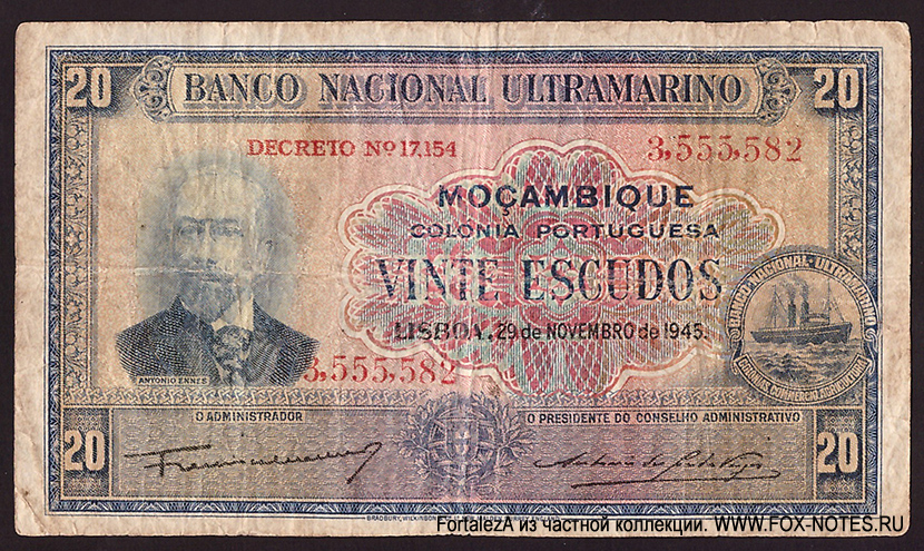 Portuguese East Africa (Estado da África, Oriental, Portuguese Mozambique), Colonial possessions of the Portuguese Empire {SH2.0: §II. F-A/a}  {§III}  1.1. Emission: Portuguese East Africa. Banco  Nacional Ultramarino. Issue of banknotes 1944-1947.  1.2. Manufacturer of banknotes (printing house):   Bradbury Wilkinson and Company.  1.3. Подписи: O ADMINISTRADOR, O PRESIDENTE DO CONSELHO ADMINISTRATIVO. (See sign description)  1.4. Author (s) of the sign design: not known.  3.1. Standard Catalog of World Paper Money, General  Issues, 1368-1960. Krause Publications; Sixteenth Edition (16) (29. Dezember 2016) {Catalog code - "P"}