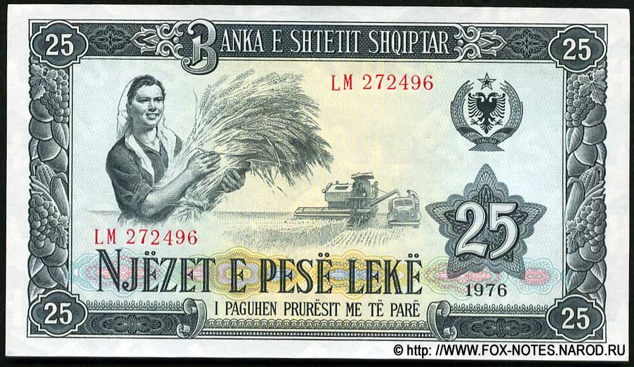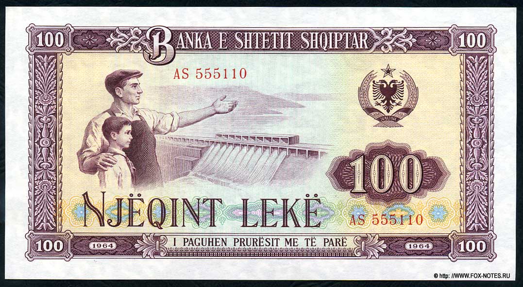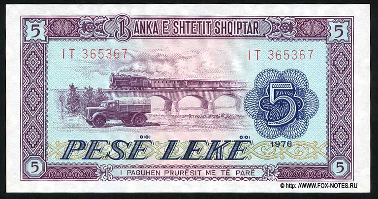 1 lek, 3 lek, 5 lek, 10 lek, 25 lek, 50 lek (serif font, 24 mm wide number), 100 lek (25 mm wide number) 1976 - China Banknote Printing and Minting Corporation (China)