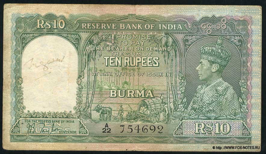 1.1. Emission: British Burma. Reserve Bank of India/Burma issues. Issue of banknotes 1938-1939.
