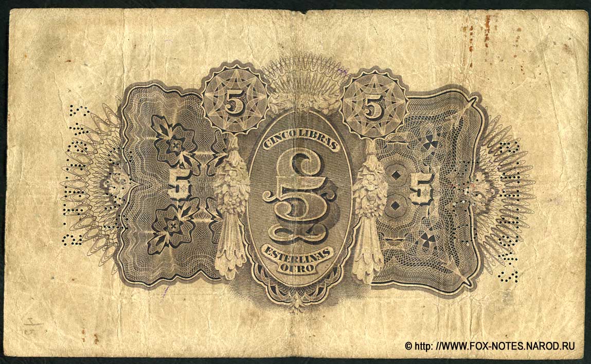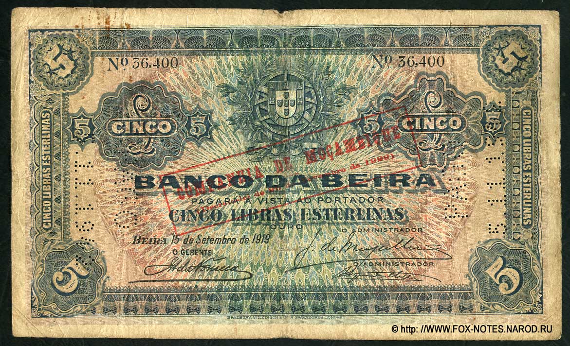Portuguese East Africa (Estado da África, Oriental, Portuguese Mozambique), Colonial possessions of the Portuguese Empire {SH2.0: §II. F-A/a}  {§III}  1.1. Emission: Portuguese East Africa. Companhia De Moçambique,  Beira. Issue of banknotes of 1919, in libra (pounds sterling) - Libra Esterlina). Overprint on 1919 Banco da Beira issues.  1.2. Manufacturer of banknotes (printing house): unknown.  1.3. Captions: Signatures of the original sign.  3.1. Standard Catalog of World Paper Money, General  Issues, 1368-1960. Krause Publications; Sixteenth Edition (16) (29. Dezember 2016) {Catalog code - "P"}