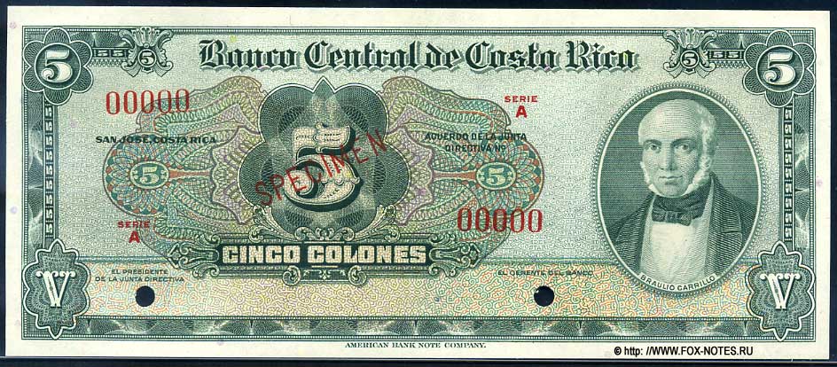 BANCO CENTRAL DE COSTA RICA 5 colones specimen