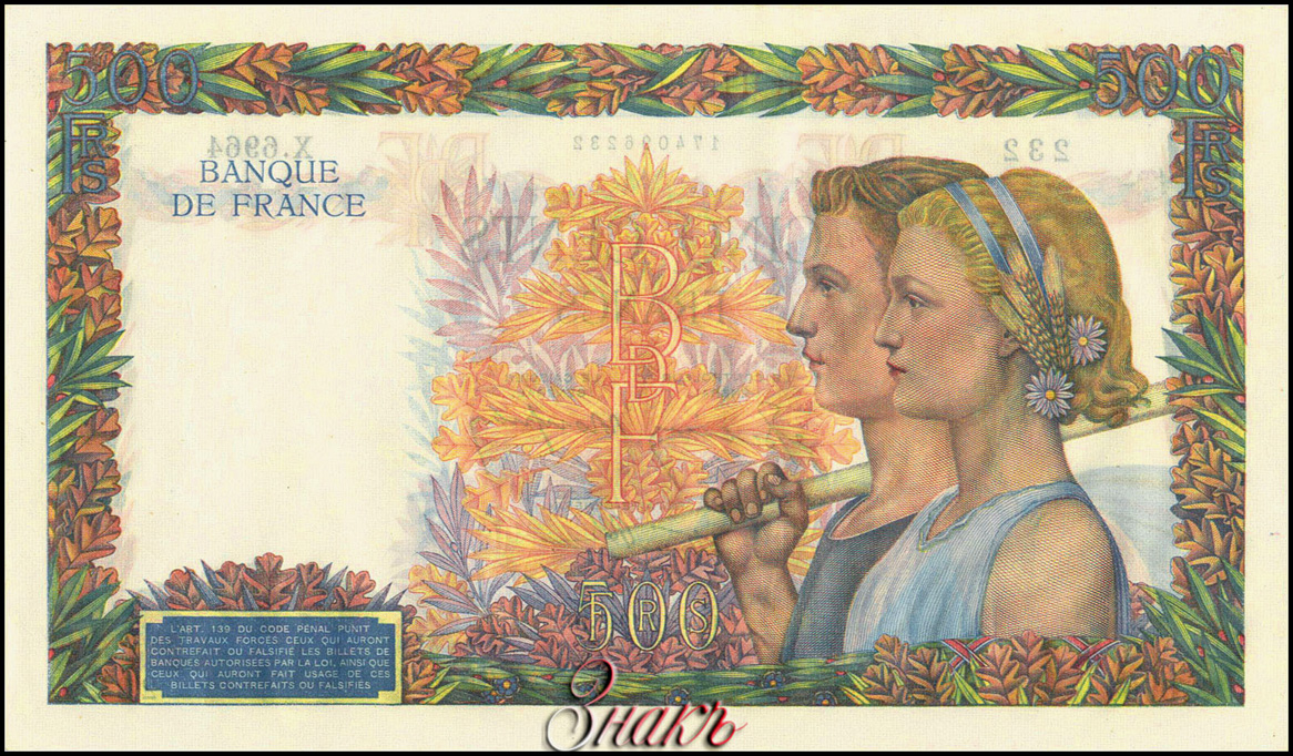 1. Banknotes of 500 francs type 1939 "La Paix" dated 1945 were not in circulation. Known copies without numbering and signatures, as well as one-sided signs.