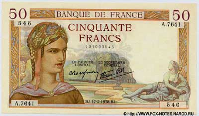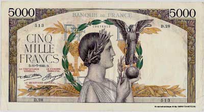 20 francs type 1940 "Travail et Science" SPECIMEN 50 francs type 1933 "Cérès" 2. For variants of tickets 50 francs type 1933 "Cérès" for dates see reference - Banque de France 50 francs type 1933 "Cérès" variants.  3. For variants of tickets 100 francs type 1939 "Sully" for dates see reference - Banque de France 100 francs type 1939 "Sully" variants.  4. For variants of tickets 500 francs type 1939 "La Paix" for dates see reference - Banque de France 500 francs type 1939 "La Paix" variants.  5. For variants of tickets 1000 francs type 1939 "Commerce et Industrie" for dates see reference - Banque de France 1000 francs type 1939 "Commerce et Industrie" variants.  6. For variants of tickets 5000 francs type 1934 "Victoire" for dates see link - Banque de France 5000 francs type 1934 "Victoire" variants.  7. * 1 Photo of the banknote from the auction of the Auction House Sign.