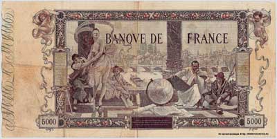 REFERENCE: Banque de France. Type - 1918. 5000 francs type 1918 "Flameng." Banknotes were printed from January 2 to January 29, 1918. Issued since September 26, 1938. Withdrawn from circulation on June 4, 1945.
