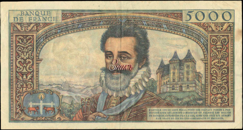 REFERENCE: Banque de France 5000 francs type 1957 "Henri IV" variants.