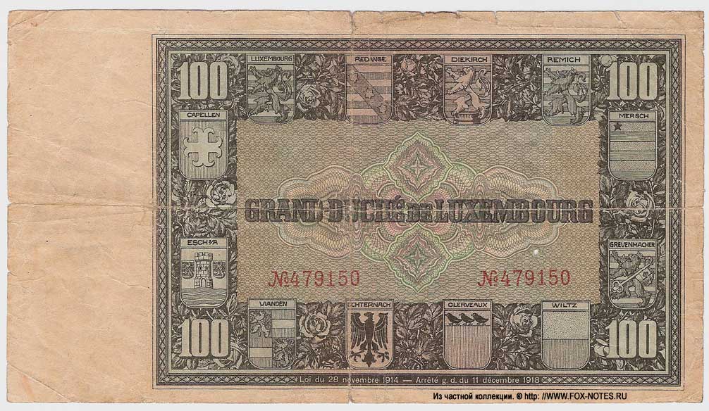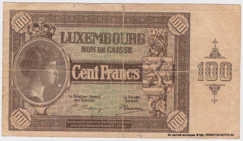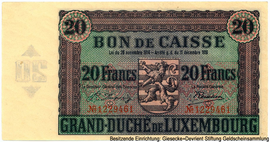 Grand Duchy of Luxembourg (Groussherzogtum Lötzebuerg, Grossherzogtum Luxembourg, Grand-Duché de Luxembourg) {SH2.0: §II. F-A/a}  {§III}  1.1. Issue: Grand Duchy of Luxembourg. Grand-duche de Luxembourg. Release of box office booms 1923-1927.  1.2. Manufacturer of banknotes (printing house):   mp. F. van S.A. Buggenhoudt, Brussels - 10 francs  Giesecke & Devrient, Germany - 20, 100 francs  1.3.   Signatures:  10 francs  Л.с. Le Directeur Général des Finances - Alphonse Neyens  О.с. La Recette Générale - Nicolas Kerschen  20, 100 francs  Л.с. Le Directeur Général des Finances - Pierre Dupong  О.с. La Recette Générale - Nicolas Kerschen  1.4. Author (s) of sign design: not known 3.1. Standard Catalog of World Paper Money, General  Issues, 1368-1960. Krause Publications; Sixteenth Edition (16) (29. Dezember 2016) {Catalog code - "P"} 3.2. Willy Schneider. Catalogue Illustré du  Papier-Monnaie Luxembourgeois. Éditions: W. Schneider, Luxembourg. 1. Auflage 2006. 3.3. Romain Probst. Catalogue Illustré du  Papier-Monnaie Luxembourgeois. Editions: LUX-NUMIS, Luxembourg. 2e  Edition 1994. 3.4. Guy Rosseljong, Romain Thielen. Le  Papier-Monnaie Luxembourgeois. 2023. ISBN: 978-99959-0-827-0