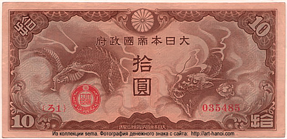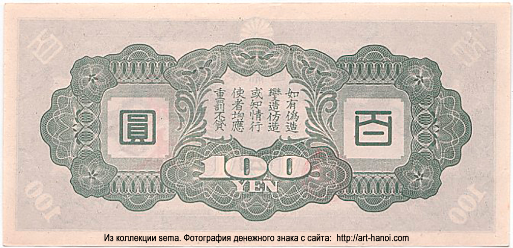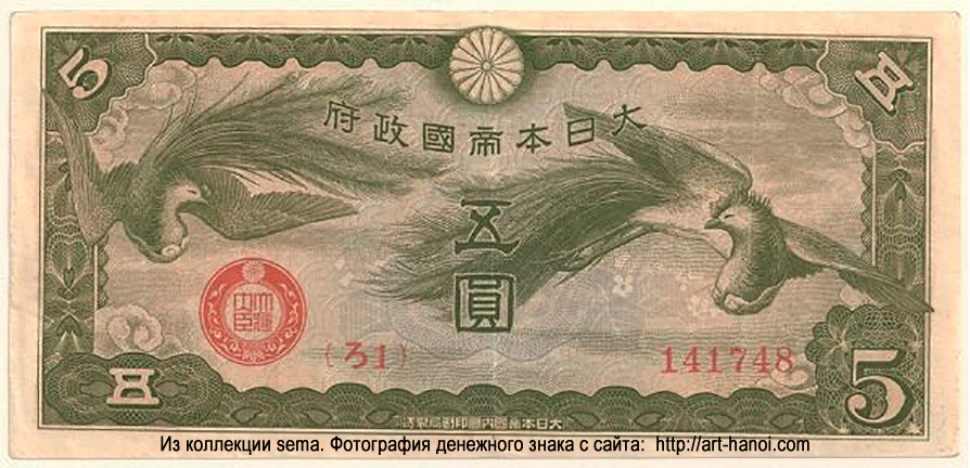 {SH2.0: §II. F-A/a}  {§III}  1.1. Issue: Japanese Imperial Government. Issue of war banknotes for French Indo-China 1940   1.2. Manufacturer of banknotes (printing house):   Imperial Press Bureau of Japan (大日本帝國印刷局製造)  1.3. Signatures: No signatures. Seal of the Minister of Finance (大蔵大臣).  1.4. Author (s) of the sign design: not known. 3.1. Standard Catalog of World Paper Money, General  Issues, 1368-1960. Krause Publications; Sixteenth Edition (16) (29. Dezember 2016) {Catalog code - "P"}