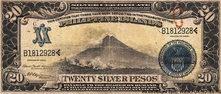 Philippine Islands Silver Certificate. 20 silver pesos 1908.