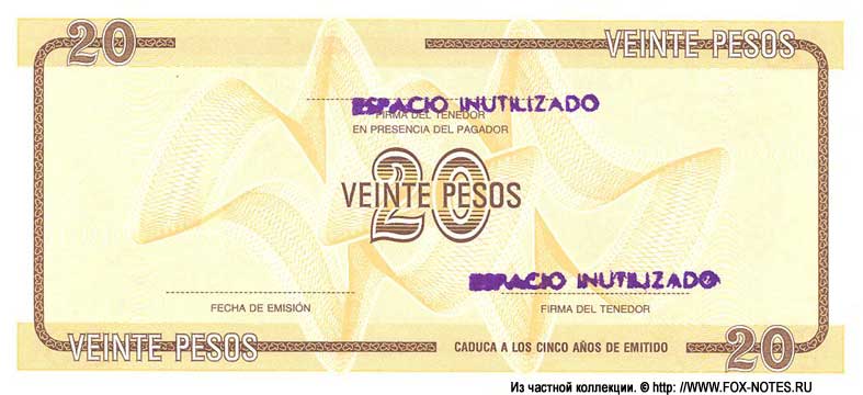 A - were issued on October 1, 1985. For the exchange of currencies of social countries (Russian text "Currency Certificate") and the exchange of BNC checks. Denominations: 1,3,5,10.20 pesos