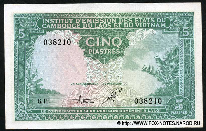 Indochinese Union (French Indochina). Institut d'émission des Etats du Cambodge, Laos et Viet-Nam. (Emission du Cambodge. Emission du Laos. Emission du Viet-Nam.)