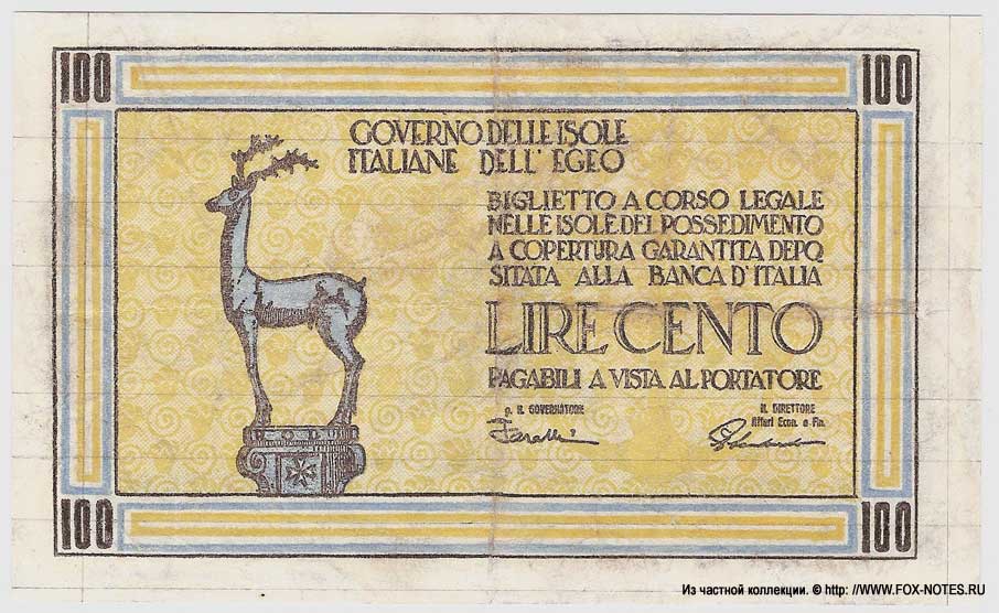 In 1943, the Allied Military Government began issuing banknotes printed in the United States. The rate was set at $1 = 100 lira, £1 = 400 lira.