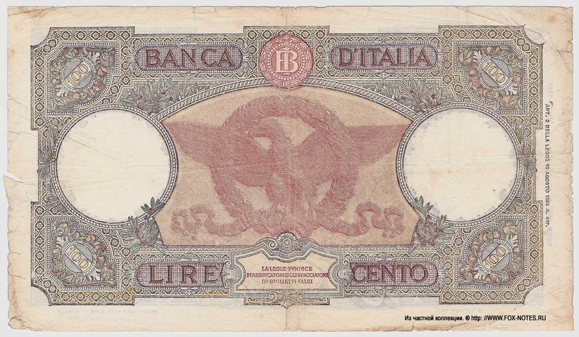 REFERENCE: Bank cards of the Bank of Italy (Banca d'Italia). Variants of the banknote 100 lire sample 1931 "ITALIA ." (1931 - 1943)