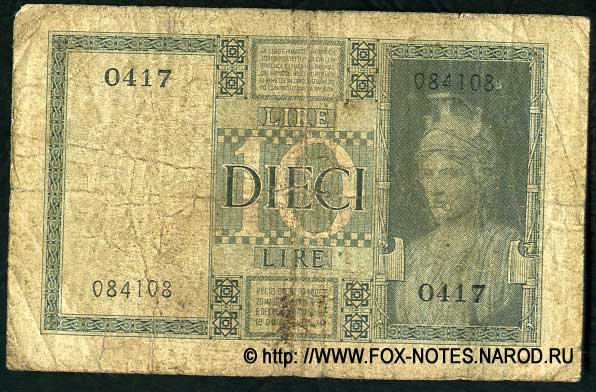 10 lire - 1944. Ppps.: Grassi, Porena, Cossu.. Series 671-800