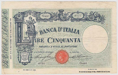 Issues under Victor Emmanuel III. Types of seals A/E. ST - IL DIRETTORE GENERALE, IL CASSIRE BI.165-170 P:47a 50 lire 1926 Sign. Stringher , Sacchi. 8.9.1926-2.6.1928. Batches A636-V865