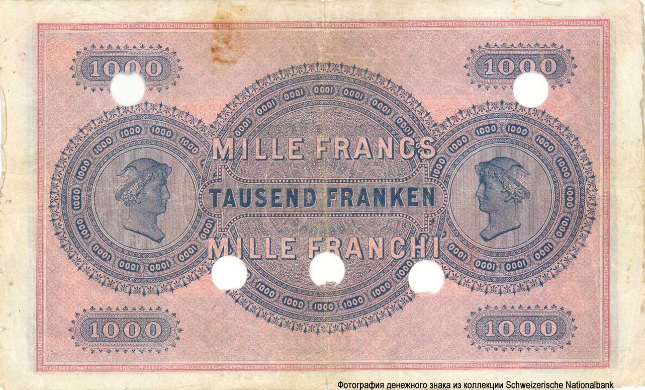 The first series of nationwide Swiss franc banknotes. Temporary release. Banknotes were printed using typical forms of banknotes of Swiss issuing banks (sample 1881).