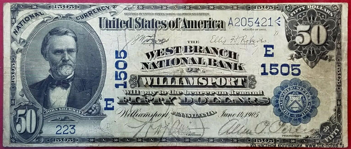 West Branch National Bank Of Williamsport 50 dollars 1905