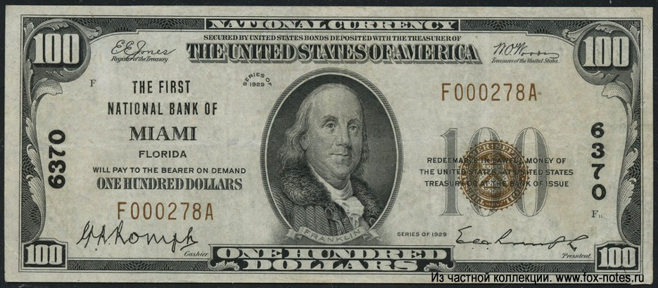333333-The First National Bank of Miami 100 dollars Series of 1929-444444