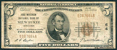 333333-First Wisconsin National Bank of Milwaukee 5 Dollars 1929 Charter number 64-444444