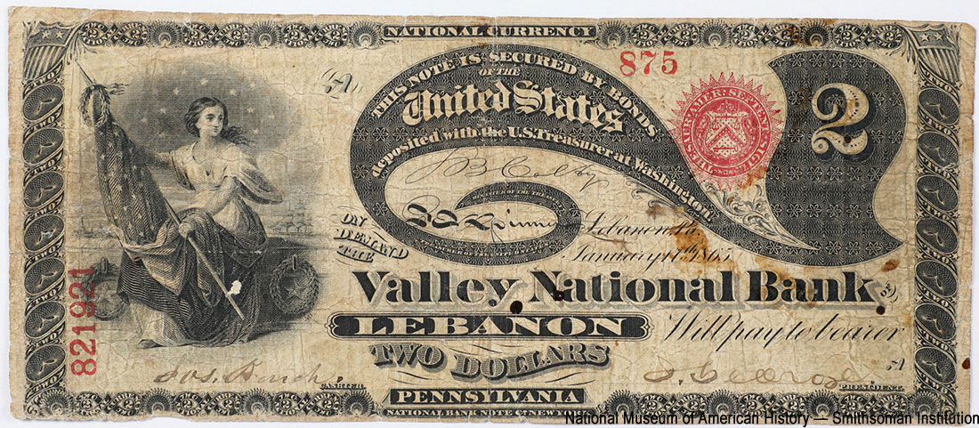 {SH2.0: §II. F-A/a} {§III} 1.1. Issue: Valley National Bank of Lebanon, Pennsylvania Charter number 655. Philadelphia, Pennsylvania. National Bank Notes. USA. Charter number: # 655 Locality: Lebanon (Lebanon) State: Pennsylvania (PA) 1.2. Manufacturer of banknotes (printing house): NATIONAL BANK NOTE CO. NEW YORK 1.3. Signatures: Register of the Treasury, Treasury of the United States (see catalogue). Cashier, President. (Signatures of bank representatives.) 1.4. Author (s) of the sign design: not known. 3.1. Don C Kelly. National bank notes: A guide with prices National bank notes. Paper Money Institute. 3rd edition (1997) Art. 423. {Code in the site catalog - "K"} 3.2. Friedberg Arthur L. , Friedberg Ira S. Paper Money of the United States. Coin & Currency Institute. 20th edition (May 15, 2013) {Cipher in the site catalog - "Fr"}